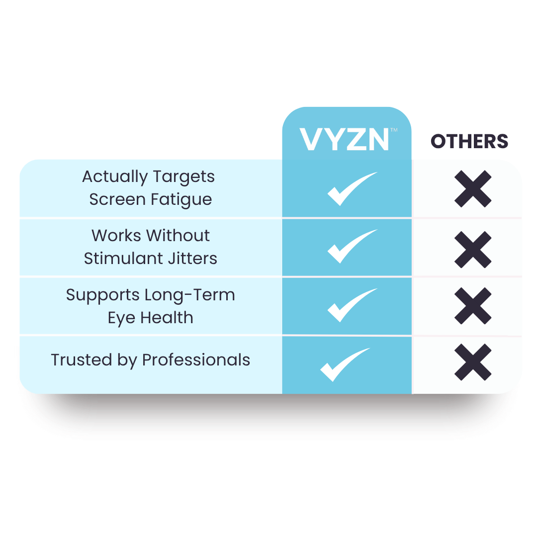 VYZN™ is the first formula engineered for screen performance, targeting both eye strain and cognitive fatigue during 10+ hour sessions.